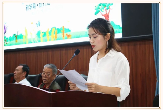 专业课教师代表程茜发言,她表示新学期,老师们都已准备好,大家会继续坚持以学生为中心,对学生负责的原则,做到爱岗敬业、以身作则,以务实的精神不断前进,立足三尺讲台,以良好的品格和高尚的情操影响学生,以丰富的知识和精益求精的教学艺术吸引学生,用饱满的激情和每一个微笑感染学生,把精湛的技能传授给学生,让学生在和谐的氛围中成长。希望同学们树立远大的理想,自强不息,用勤奋和汗水,用智慧和热情,抓住宝贵的今天,努力创造美好的明天。