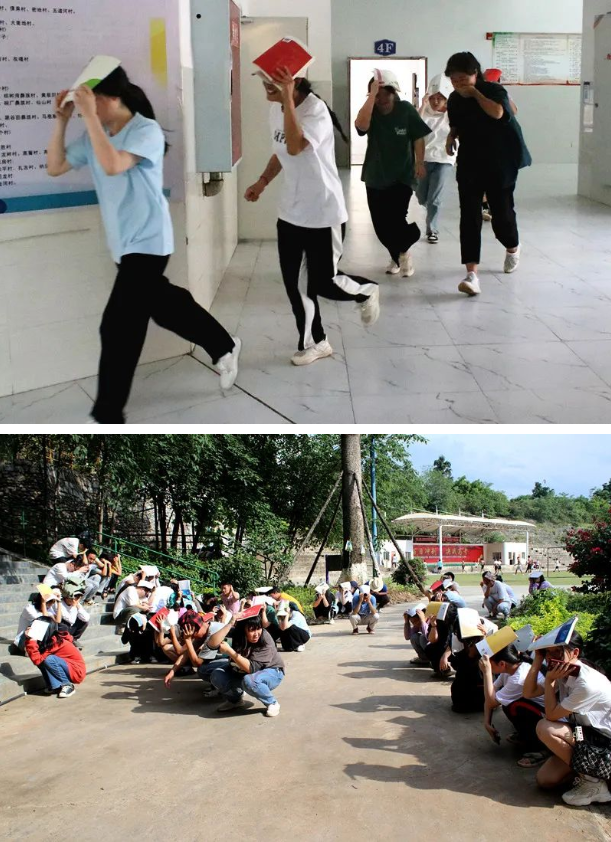 下午4时,随着一阵尖锐而又急促的警报声响起,正在教室上课的各班同学在科任老师的指挥下,迅速进行避险和逃生演练。在地震演练中,听到第一次警报声后,同学们立刻躲在桌子底下,双手抱头,做好自我防护。听到第二次警报声后,师生立即开始快速有序疏散,按指定路线撤离到教室外的空旷地区,大家俯身避险并使用书本等物品保护头部,班长清点人数并上报。