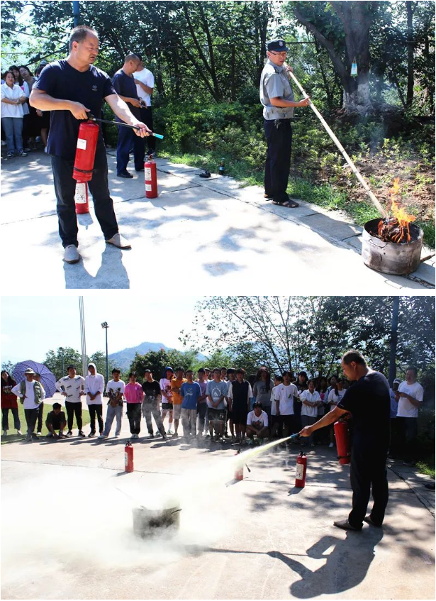 在灭火演练中,大家不惧烈日的暴晒,围在操场的一角,倪继成副处长再次讲解和示范了干粉灭火器的使用方法。学生代表轮流上阵,在工作人员的指导下,利用手中的灭火器,一次次扑灭熊熊燃烧的大火。整个演练过程师生们毫不慌乱,按提前制定好的演练方案,工作人员各司其职、积极主动,演练圆满完成。