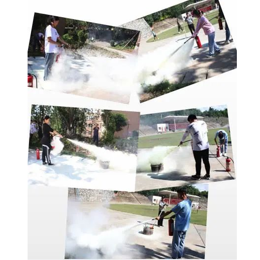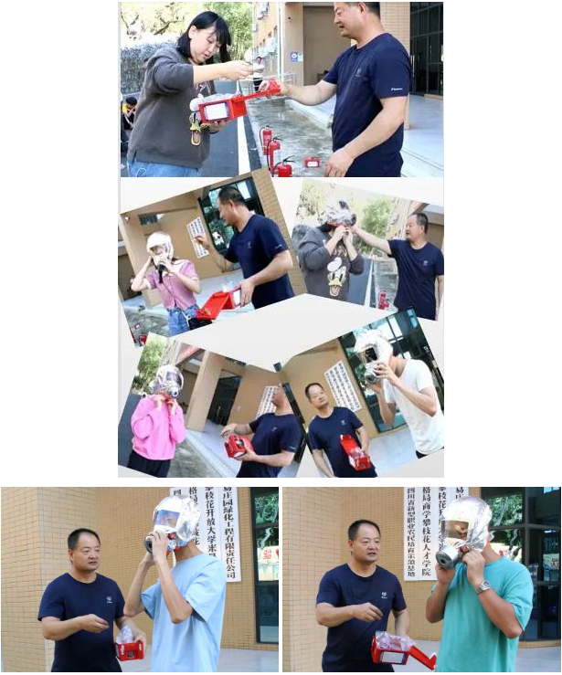 他演示了干粉灭火器和过滤式消防自救呼吸器的使用方法,并让同学亲自实践,同时给予指导。