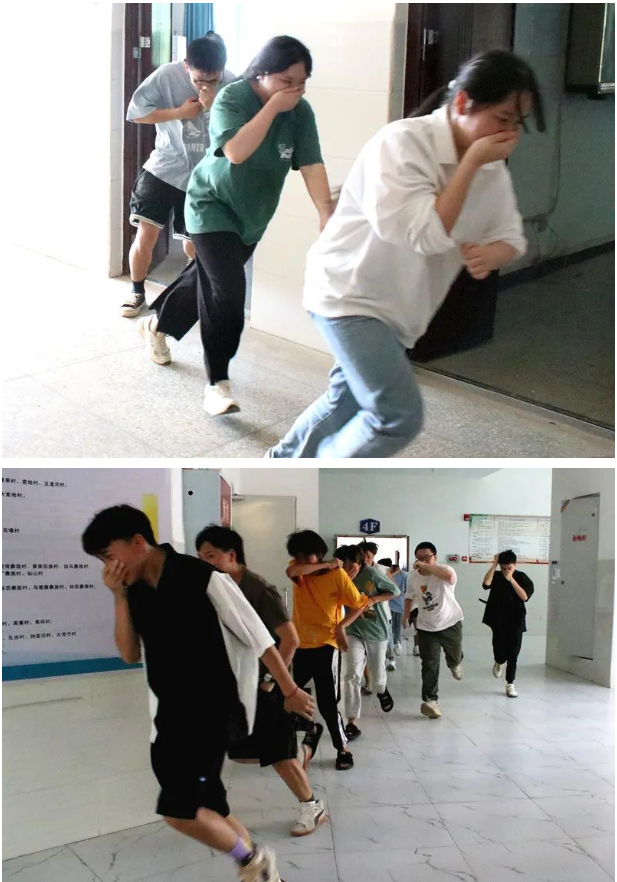在消防逃生演练中,当警报声响起,正在教室上课的同学们迅速手捂住口鼻,在老师的组织下,弯腰、有序、安全地按预定撤离路线迅速撤离到操场,并及时清点人数并上报老师。