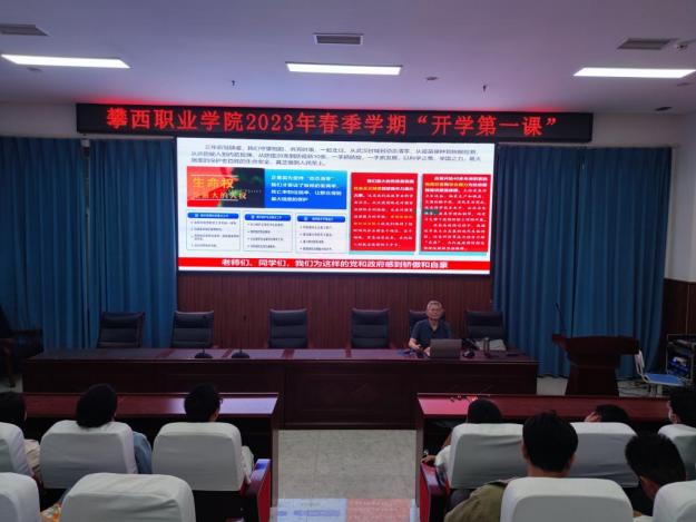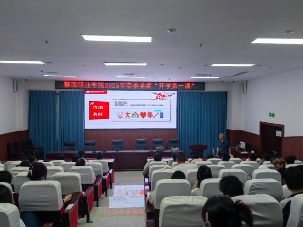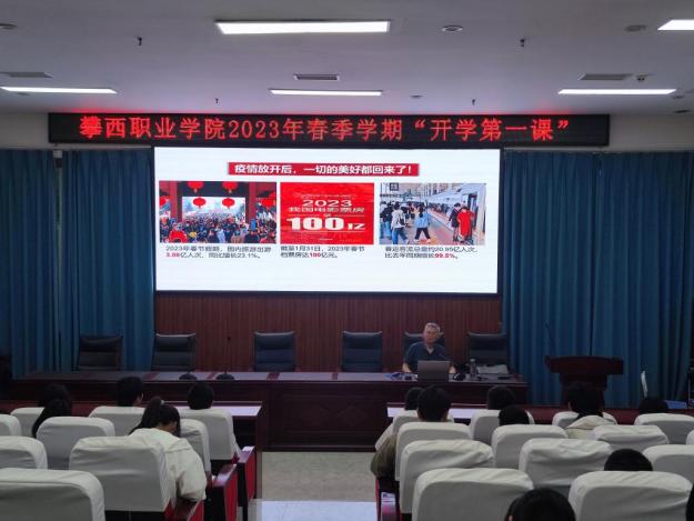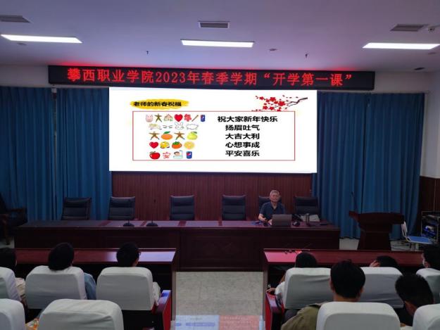 新学期、新气象。攀西职院2023年春季学期以“向往美好 勇毅前行”为主题的“开学第一课”于3月28日在实训楼二楼阶梯教室开展,攀西职院全体学生参会,省督导专员、学院书记万辉君主讲。