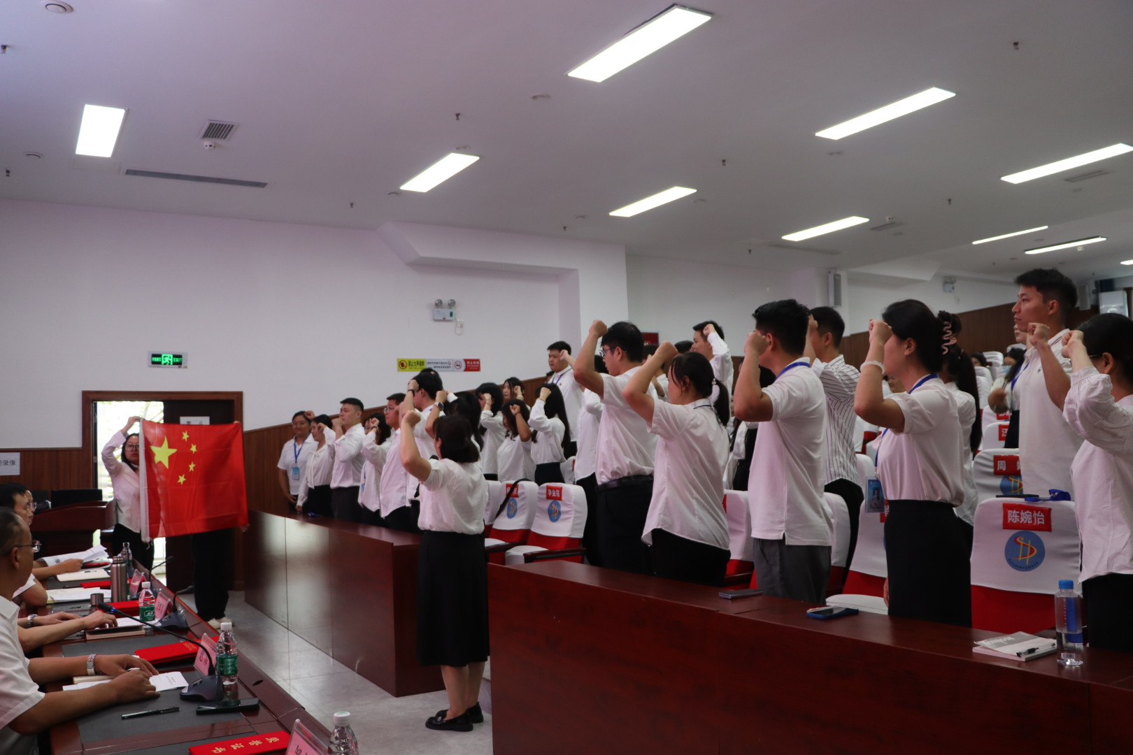 庆祝大会上,所有新入职教师在组织人事处处长马小林的带领下面对鲜艳的五星红旗庄严宣誓。