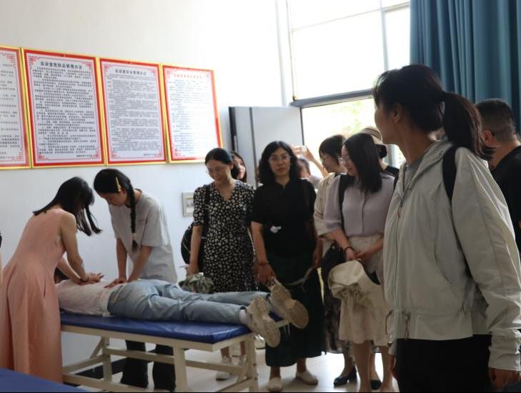 在学院领导的陪同下,专家组一行实地考察了人体形态学实训室、急救室实训室、健康评估实训室、中医养生保健实训、中医针灸推拿实训室、中医药膳实训室、婴幼儿保健实训室等实训教学场地。学院相关负责人详细介绍了实训室的设备功能、教学模式及学生实践成果,展示了健康管理产业学院“理论+实践+产业应用”的一体化培养体系。专家组对中医药膳等特色项目给予了充分肯定,对当地康养产业有着十分重要的意义。中医2023级学生展示了推拿按摩实训课场景,受到了专家组的一致好评。