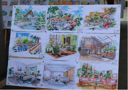 插画奇幻天地:插画设计展区打开脑洞,走进奇妙的插画世界!精彩故事演绎:一个个可爱的IP形象、一段段引人入胜的插画故事,用艺术语言讲述着创作者的奇思妙想。 风格多元碰撞:清新治愈的水彩插画、时尚潮流的扁平插画、充满韵味的国风插画,风格各异,精彩纷呈。通过此次联展,同学们仿佛手绘时光长廊,效果图表现技法展区一支画笔,一张画纸,勾勒真实与想象的桥梁!空间光影盛宴,细腻的建筑透视图、质感满满的室内效果图,用马克笔、水彩重现空间温度!场景速写魅力,街头巷尾、自然景观的即兴创作,捕捉瞬间灵感,感受手绘的独特生命力。
